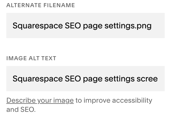 Images play a significant role in SEO. Search engines cannot comprehend images, but they can read the alt text associated with them. All images that aren’t purely decorative should have descriptive alt text. To update alt text in Squarespace: